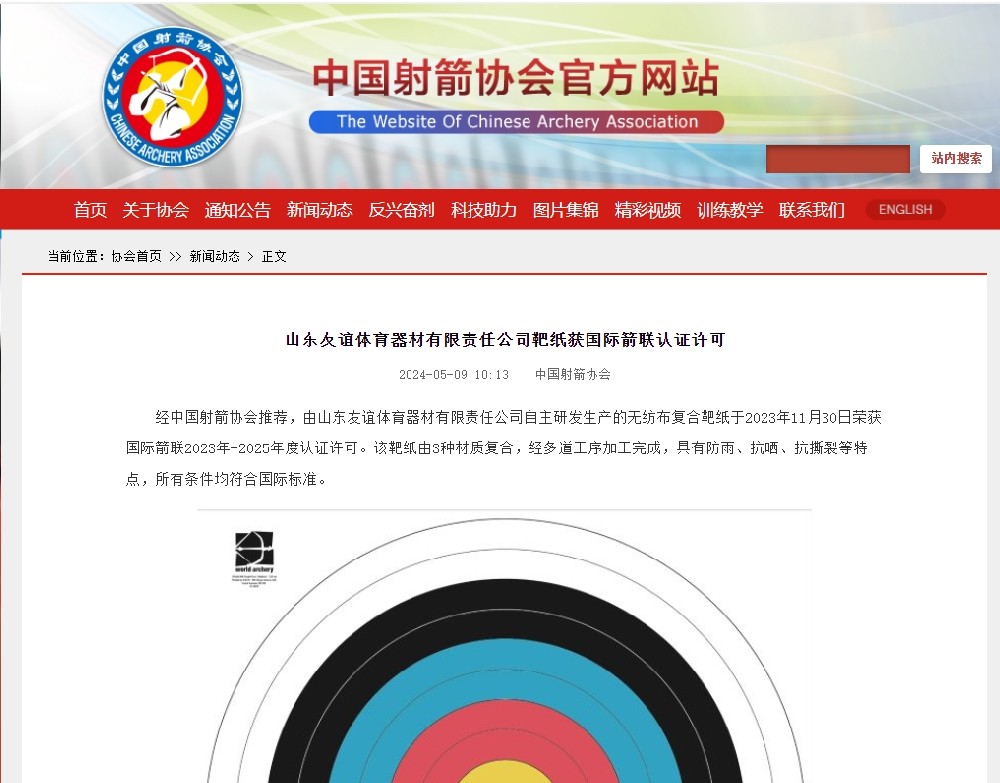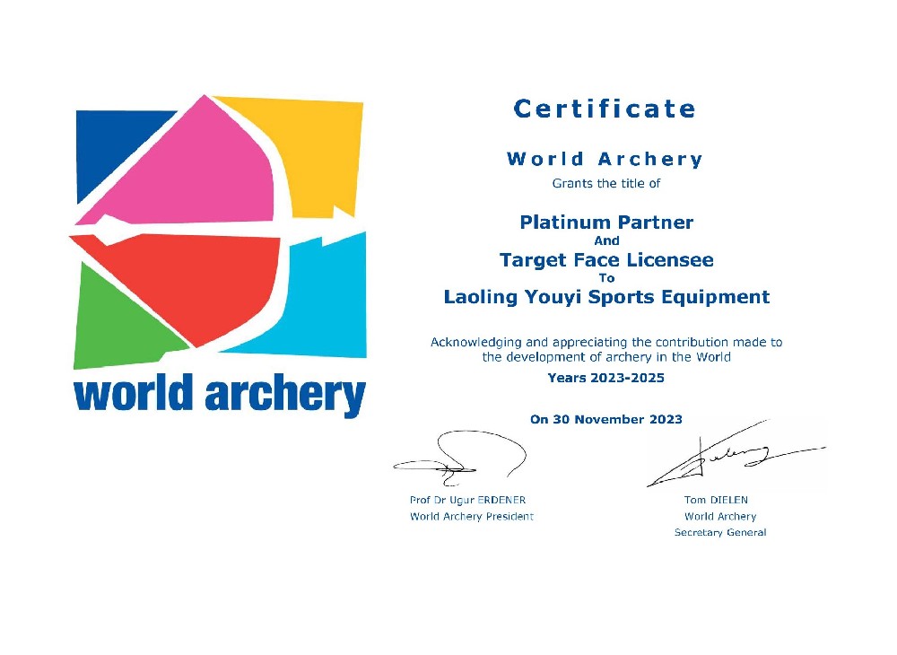 目前,主要生產(chǎn)和銷售射箭比賽及訓(xùn)練專用器材,包括:箭靶、靶紙、靶架、號碼牌、風(fēng)向旗、計(jì)時(shí)記分器等場地器材設(shè)備;反曲弓、復(fù)合弓、傳統(tǒng)弓、瞄準(zhǔn)器、防震桿等弓箭裝備;箭壺、護(hù)胸、護(hù)臂、護(hù)指等各類箱包護(hù)具。公司所生產(chǎn)的射箭器材已通過國際射箭聯(lián)合會及中國射箭協(xié)會CAA認(rèn)證。